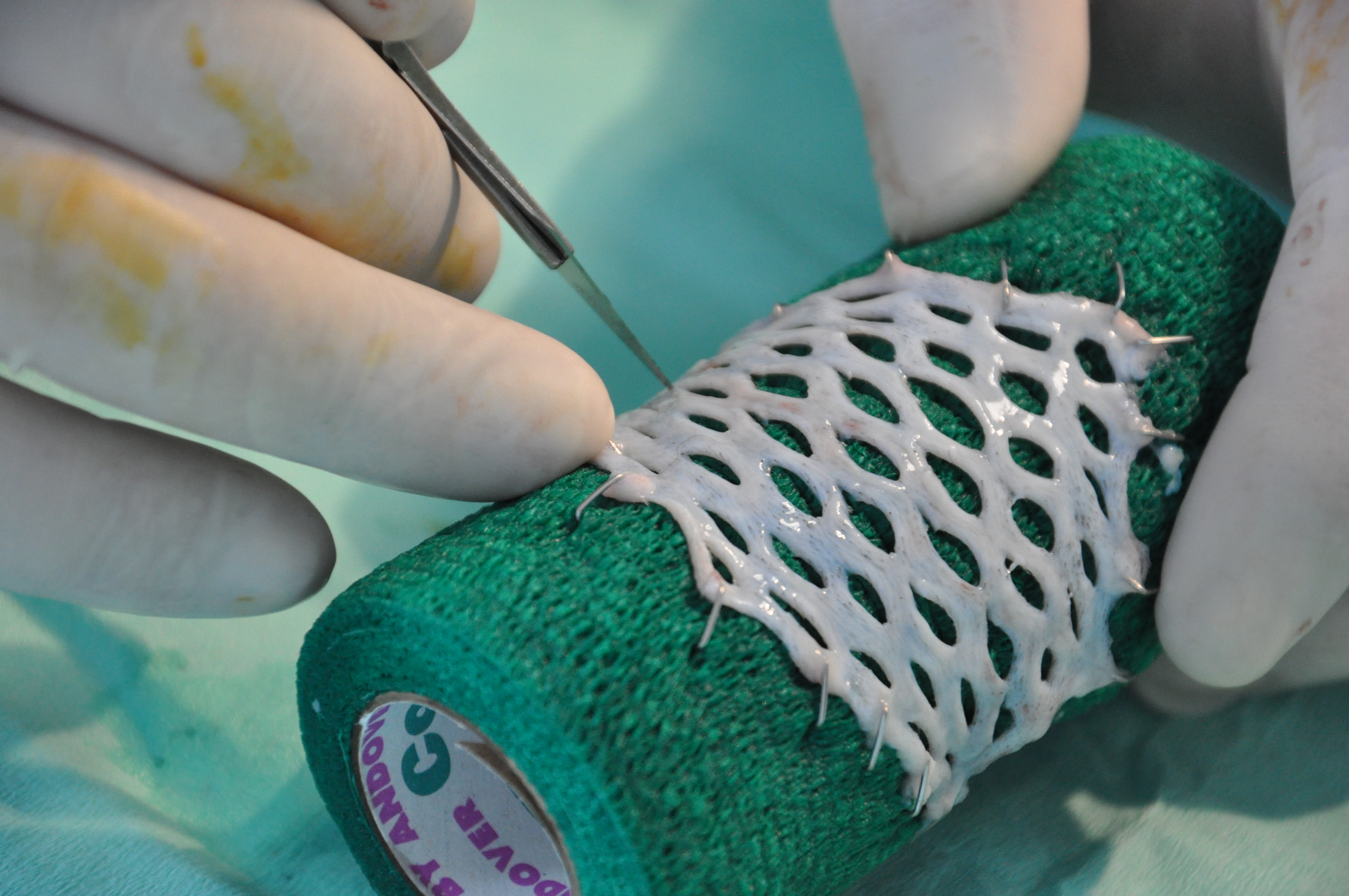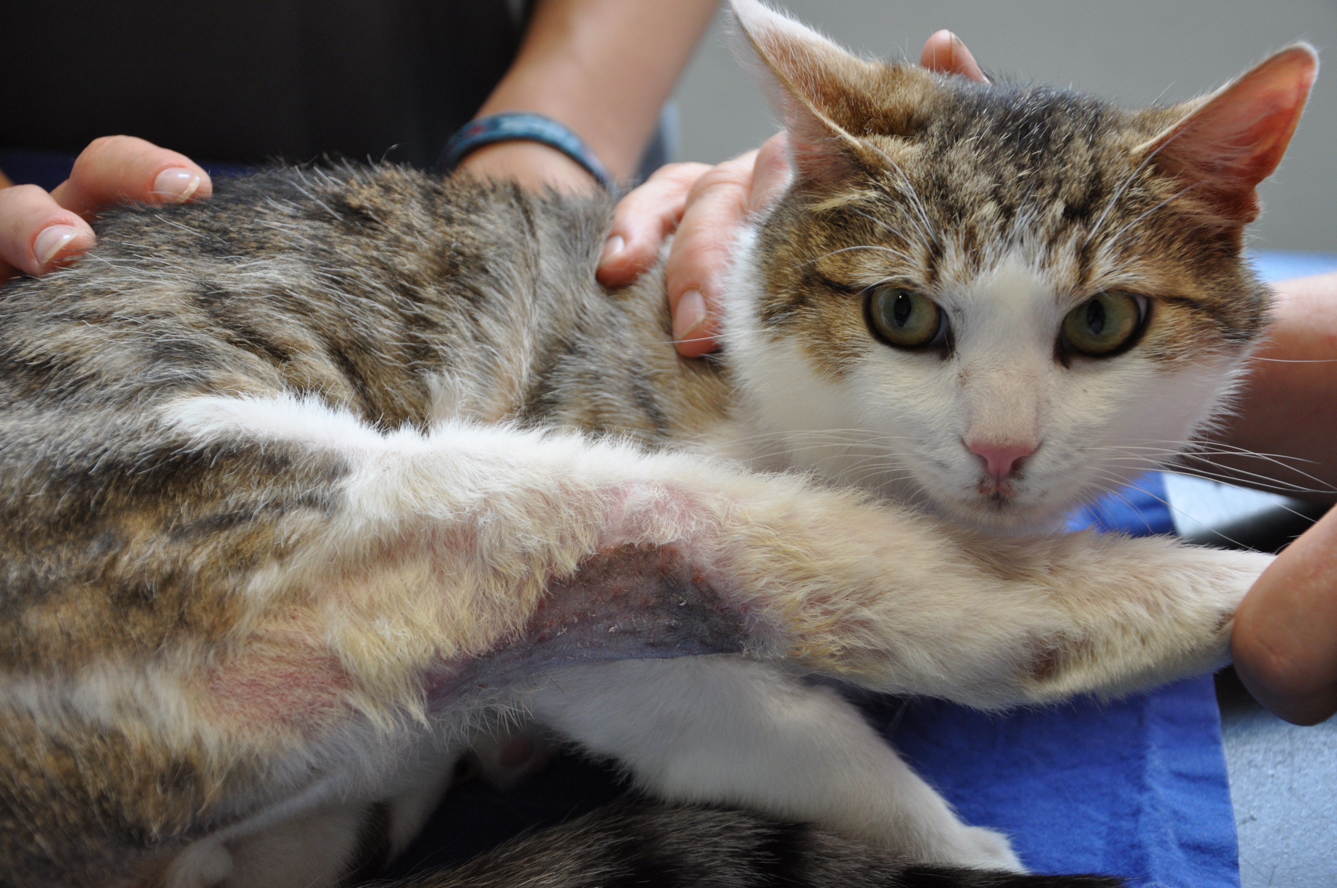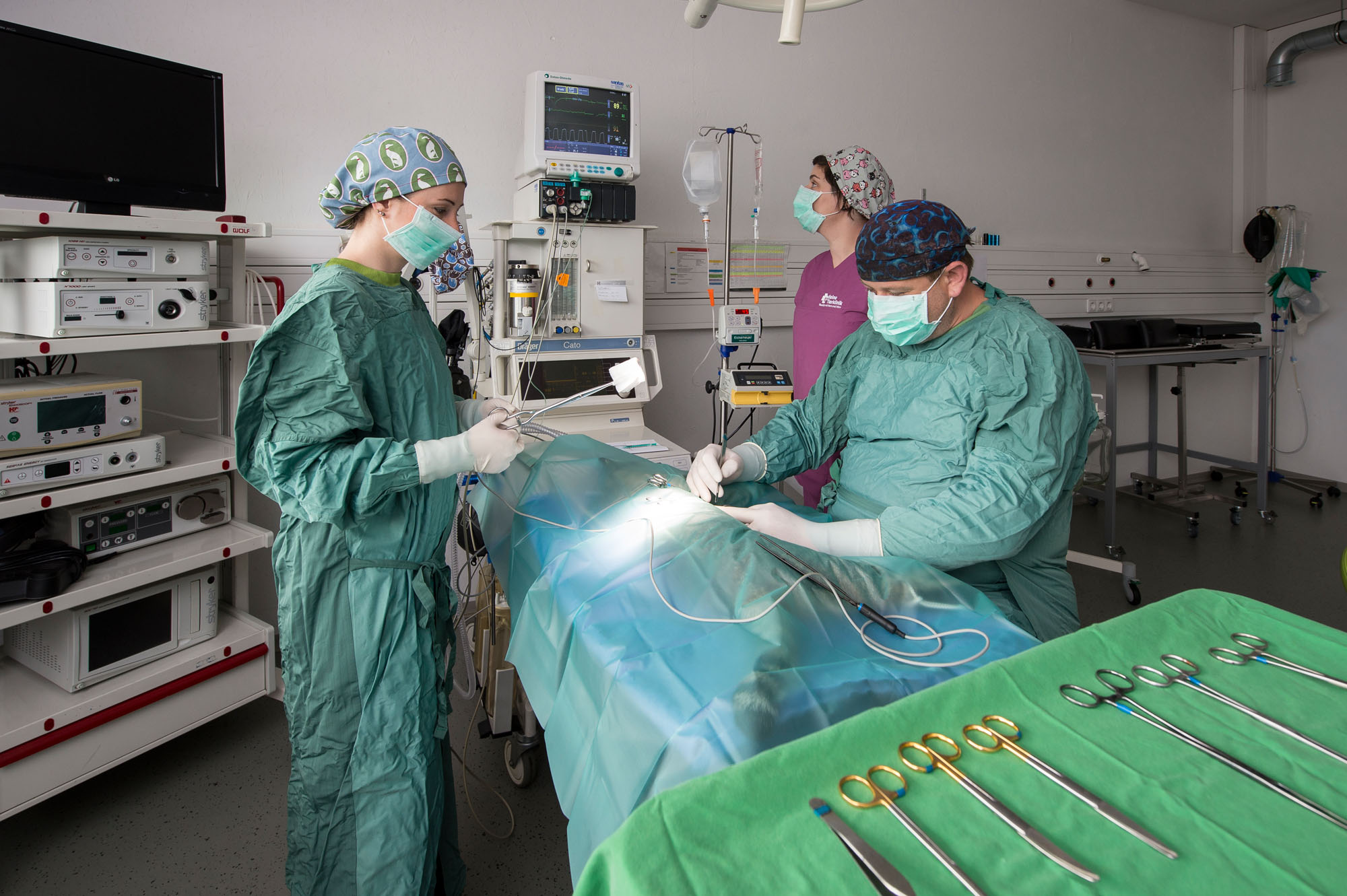 Anstatt für die Kastration den Bauchraum zu öffnen, operieren wir unsere vierbeinigen Patienten mit einer als „Knopflochchirurgie“ bezeichneten Operationsmethode, bei der nur drei kleine Einstiche durch Haut und Bauchdecke gemacht werden.